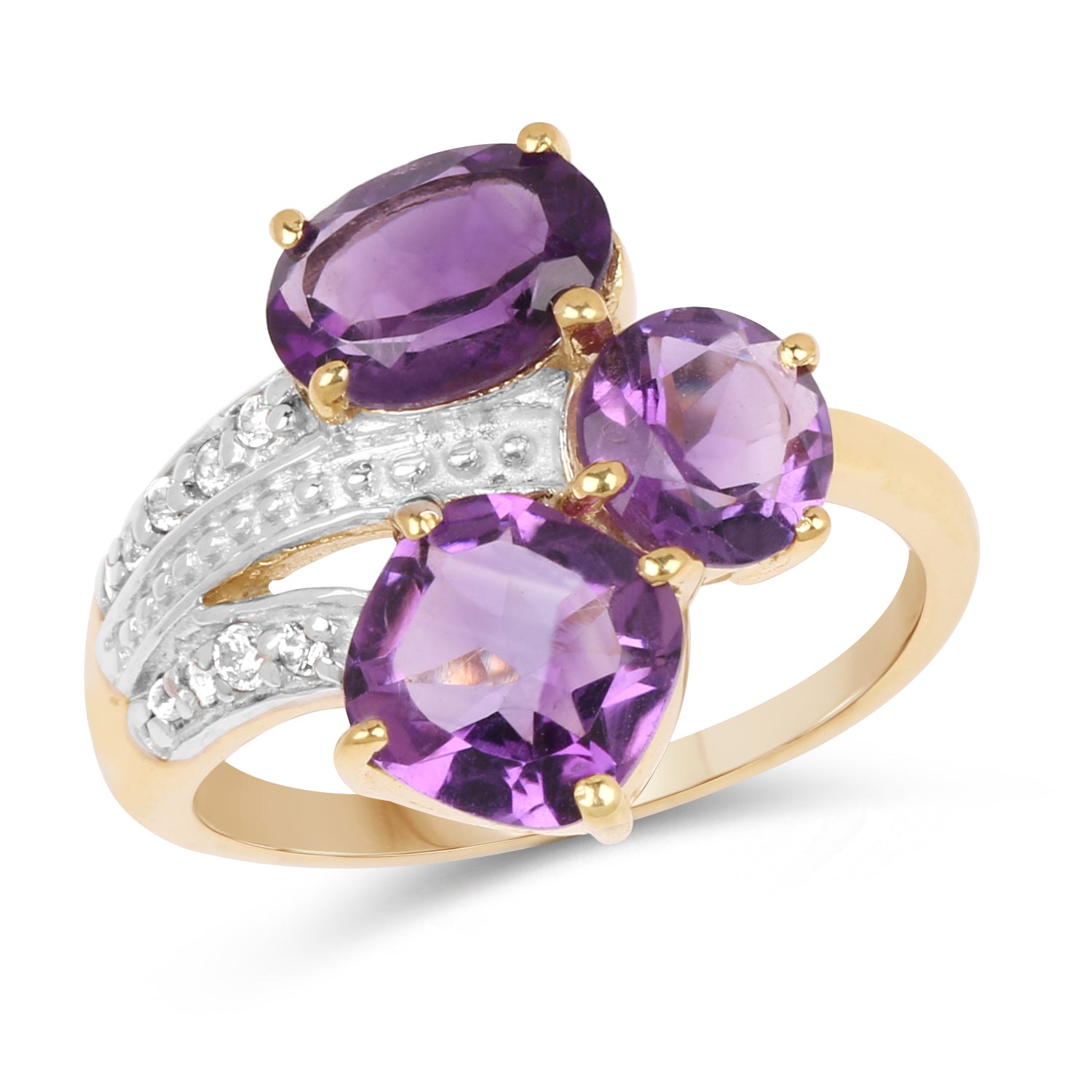 14K Yellow Gold Plated 3.15 Carat Genuine Amethyst and White Topaz .925 Sterling Silver Ring