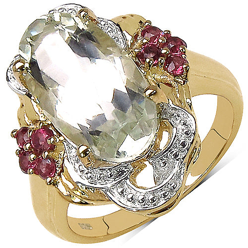 14K Yellow Gold Plated 4.65 Carat Genuine Green Amethyst & Rhodolite .925 Sterling Silver Ring