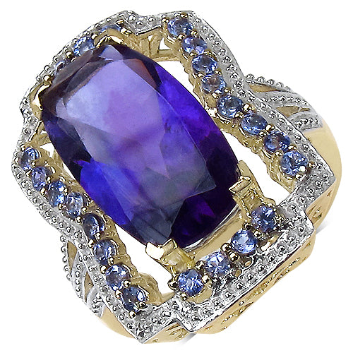 14K Yellow Gold Plated 7.64 Carat Genuine Amethyst & Tanzanite .925 Sterling Silver Ring