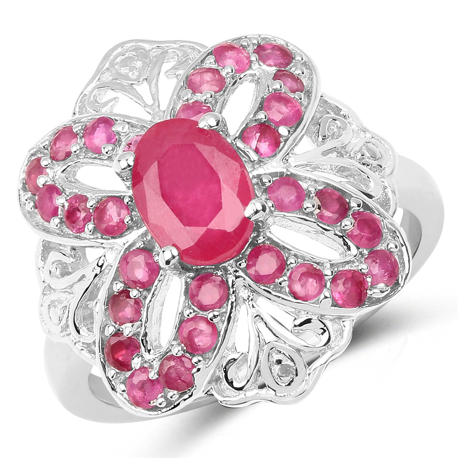 2.12 Carat Glass Filled Ruby and Ruby .925 Sterling Silver Ring Ruby Glass Filled:Oval/7x5mm 1/1.00 ct.w + Ruby:Round/1.70mm 28/1.12 ct.w