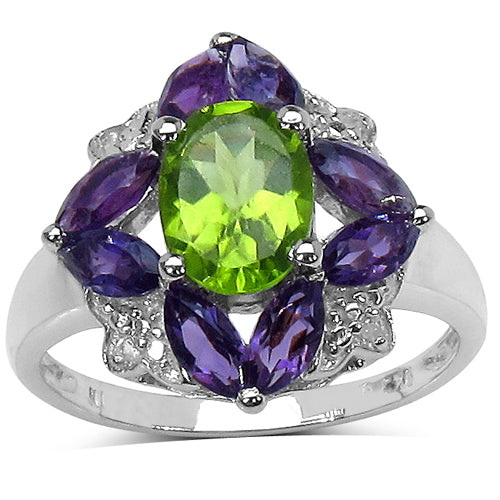 2.42 Carat Genuine Peridot, Amethyst & White Diamond .925 Sterling Silver Ring