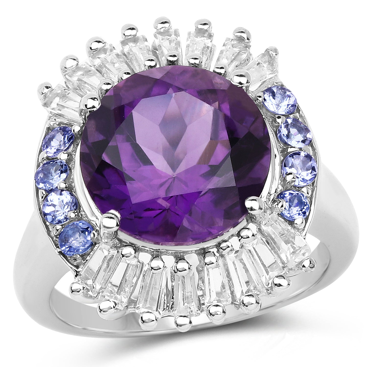5.24 Carat Genuine Amethyst, Tanzanite & White Topaz .925 Sterling Silver Ring Amethyst:Round/11.00mm 1/4.00 ct.w + Tanzanite:Round/2.00mm 8/0.28 ct.w + Topaz White:Baguette/3.00x1.50x1.10mm 16/0.96 ct.w