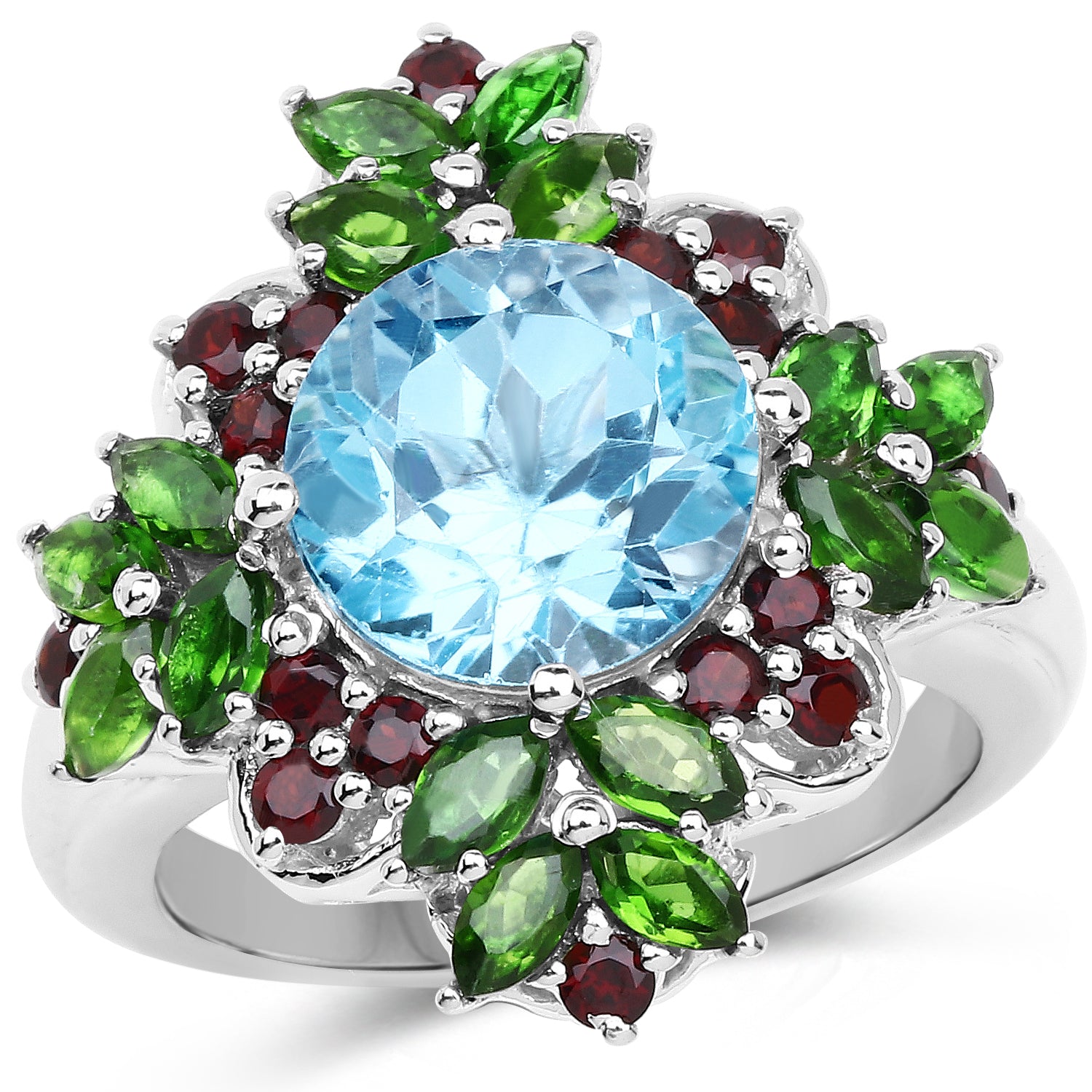 5.76 Carat Genuine Blue Topaz, Chrome Diopside & Garnet .925 Sterling Silver Ring