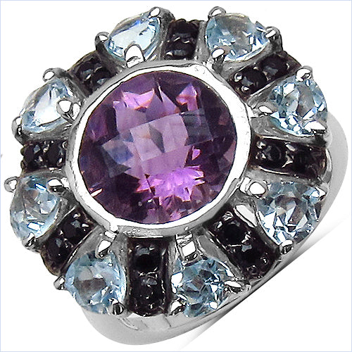 6.12 Carat Genuine Amethyst, Blue Topaz & Black Spinel .925 Sterling Silver Ring