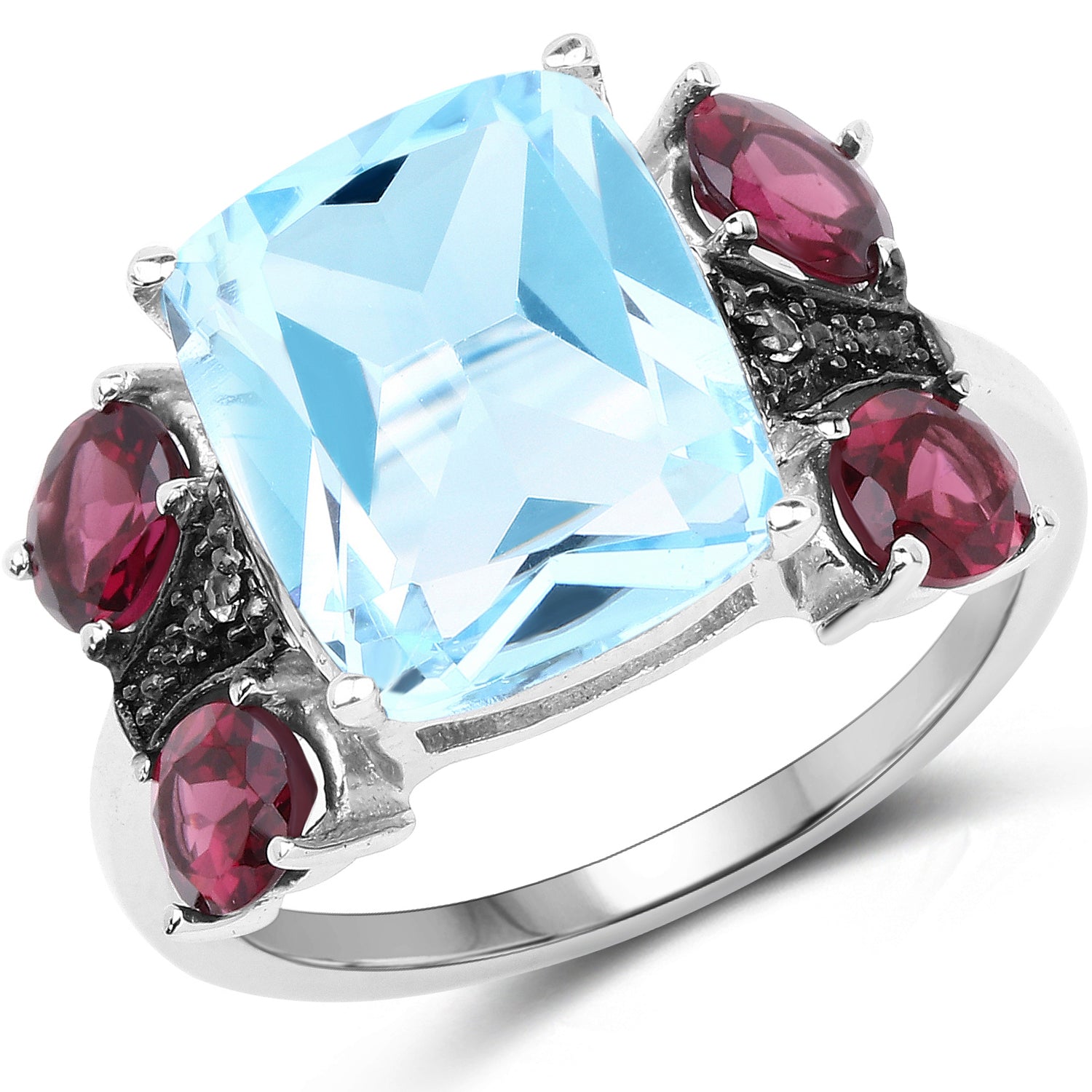 6.39 Carat Genuine Blue Topaz, Rhodolite & White Topaz .925 Sterling Silver Ring Topaz Blue:Cushion/12x10mm 1/4.70 ct.w + Rhodolite:Oval/5x4mm 4/1.68 ct.w + Topaz White:Round/1.00mm 2/0.01 ct.w
