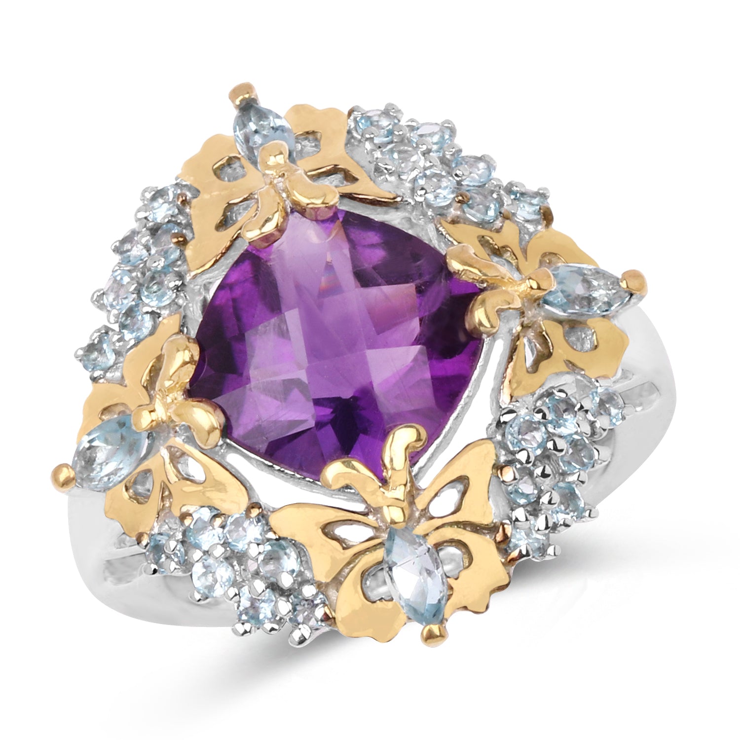 Two Tone Plated 4.45 Carat Genuine Amethyst & Blue Topaz .925 Sterling Silver Ring