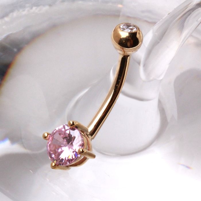 Fulfilled by our friends at Fashion Hut Jewelry14Kt Gold Navel Ring with Prong Set Round CZ.14 Kt. Yellow Gold Belly Button Ring/Navel Ring with prong set Round Cubic Zirconia.4mm Top ball also has press fit Clear Cubic Zirconia.Internally threaded top ball with externally threaded pin.Thickness : 14Ga / 1.6mmLength :...