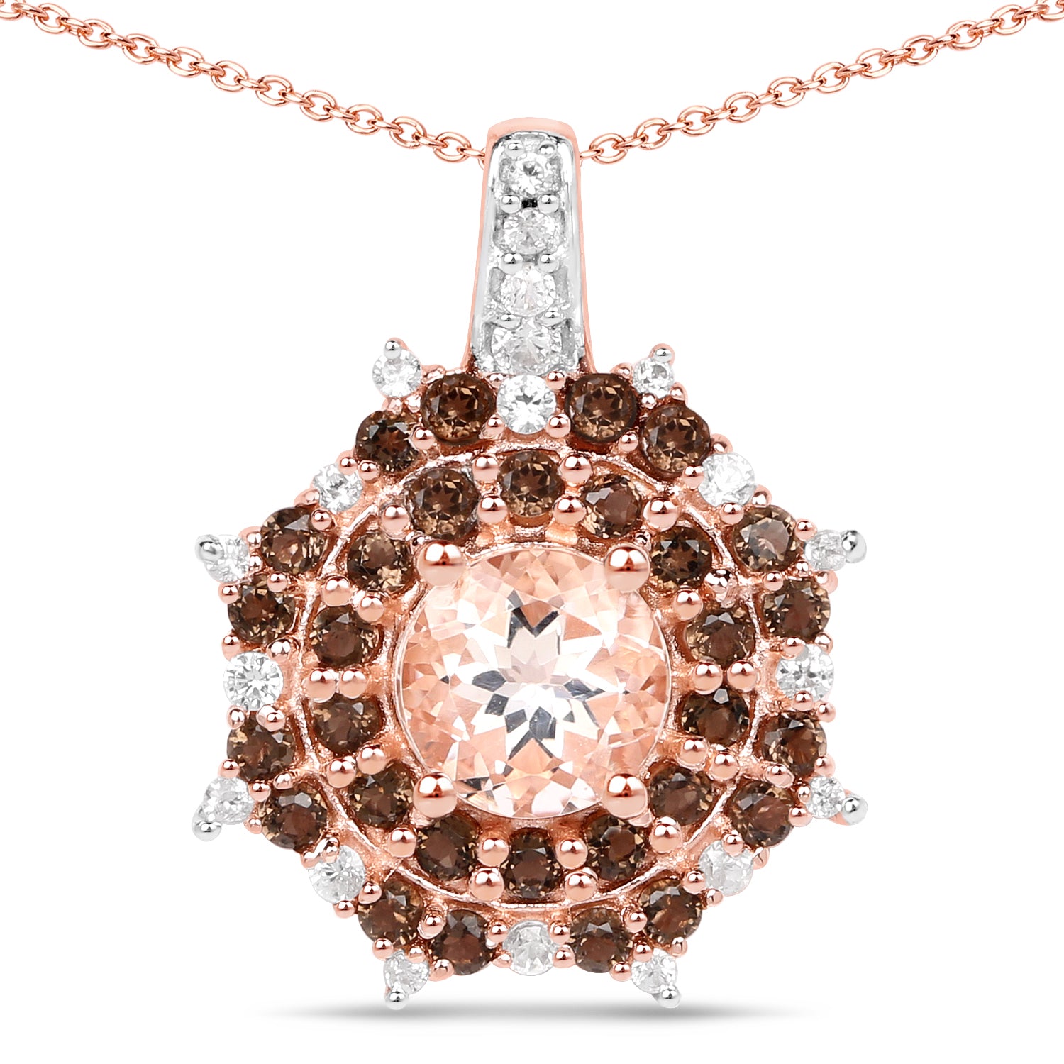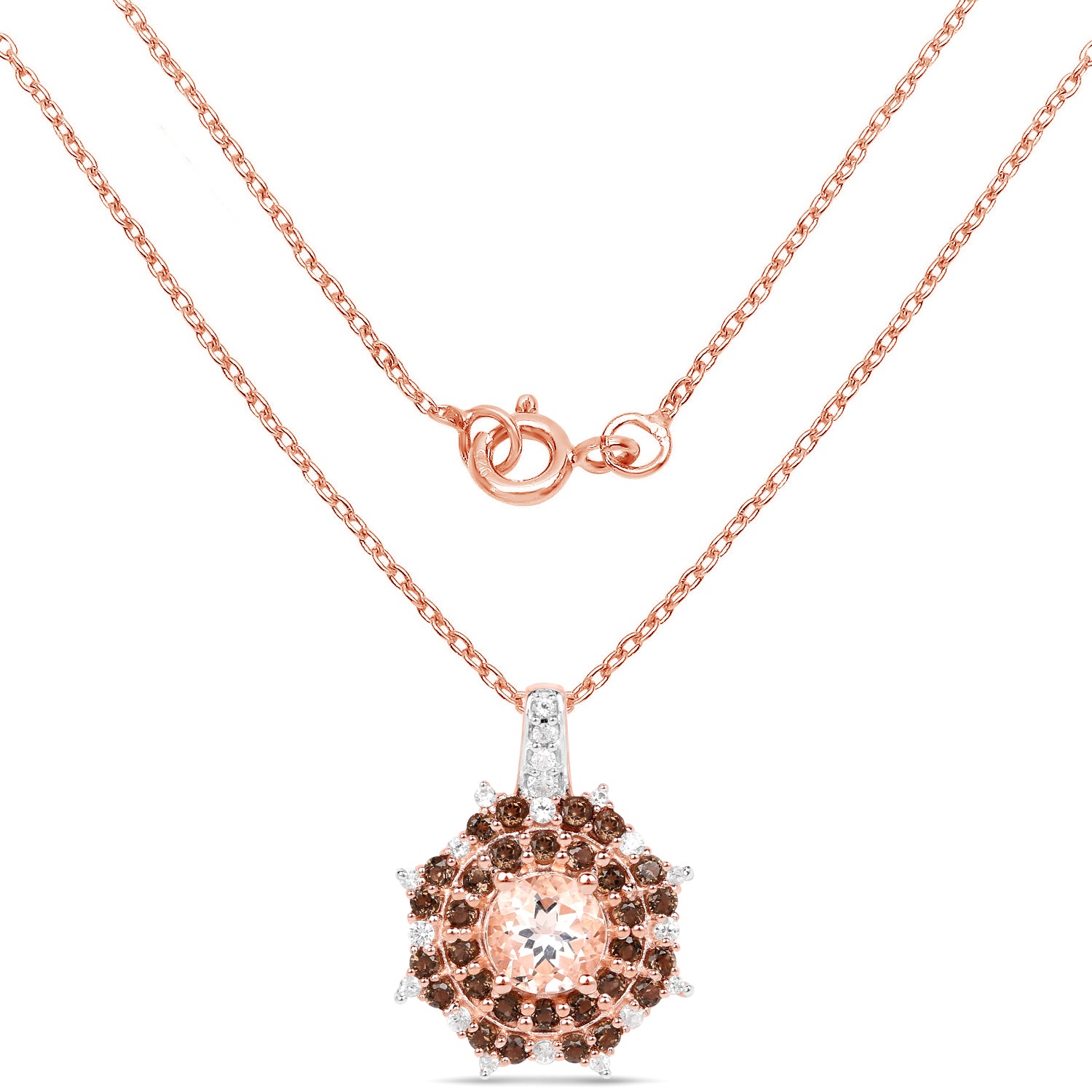 18K Rose Gold Plate 1.61 Carat Genuine Morganite Smoky Quartz & White Zircon .925 Silver Pendant Morganite:Round/6.00mm 1/0.88 ct.w + Quartz Smoky:Round/1.60mm 14/0.27 ct.w + Quartz Smoky:Round/1.50mm 16/0.24 ct.w + Zircon White:Round/1.50mm 1/0.02 ct.w + Zircon White:Round/1.30mm 8/0.12 ct.w + Zircon White:Round/1.20mm 1/0.01 ct.w + Zircon White:Round/1.10mm 9/0.06 ct.w +...