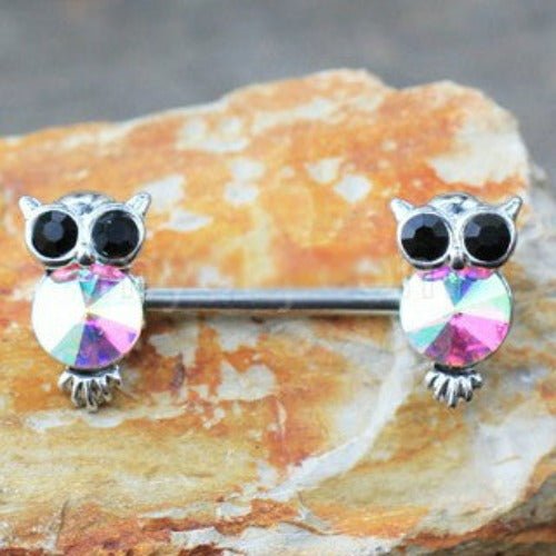 • Nipple Barbell / Nipple Jewelry with owl design• Faceted Aurora Borealis CZ on the belly of the Owl