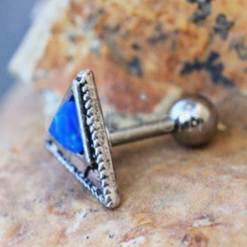 Fulfilled by our friends at Fashion Hut Jewelry• Cartilage / Tragus Earring with Triangle Design• Multiple layers of Triangles in different designs• Triangle shaped Blue Synthetic Opal• Bar Thickness : 16GA | 1.2mm• Bar Length : 1/4" | 6mm• Triangle Size : 10 x 9mm• Ball Size : 4mm• Material...