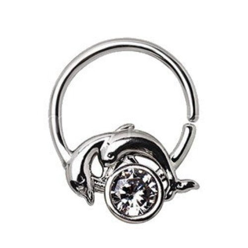 Fulfilled by our friends at Fashion Hut Jewelry• Two dolphins jumping over a CZ• 5mm Clear CZ as the moon• Seamless Ring can be used as Cartilage Earring, Lip Ring, and much more• Ring Thickness : 16GA | 1.2mm• Ring Inner Diameter : 3/8" | 10mm• Dolphin & CZ Design...