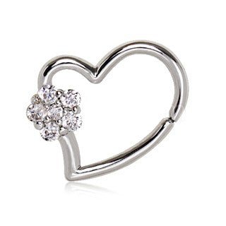 Fulfilled by our friends at Fashion Hut Jewelry• 316L Stainless Steel Heart shaped Cartilage / Tragus Earring• Clear CZ Flower on animated Heart Shape• Annealed Jewelry (Flexible)• Bar Thickness : 16GA | 1.2mm• Diameter : 3/8" | 10mm• Material : 316L Stainless Steel, Cubic Zirconia