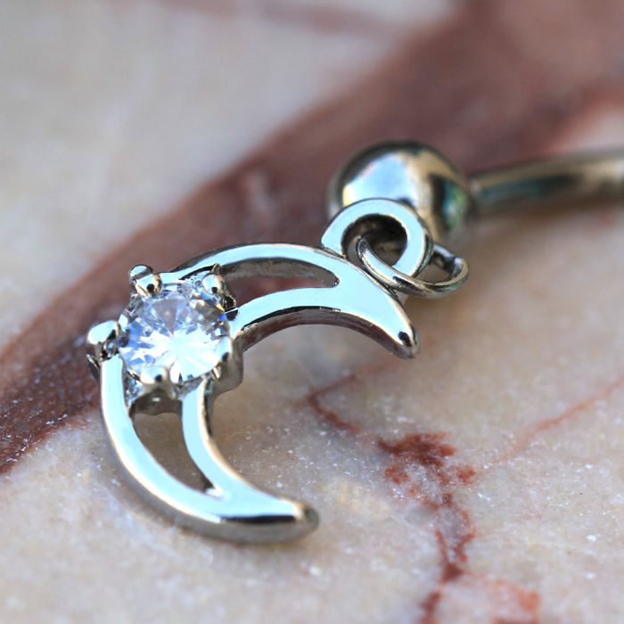 Fulfilled by our friends at Fashion Hut Jewelry• Navel Ring / Belly Button Ring with a Moon & Star Dangle• Steel balls on top and bottom• Crescent moon and Clear round CZ as a star• Bar Thickness : 14GA | 1.6mm• Bar Length : 3/8" | 10mm• Ball Size :...