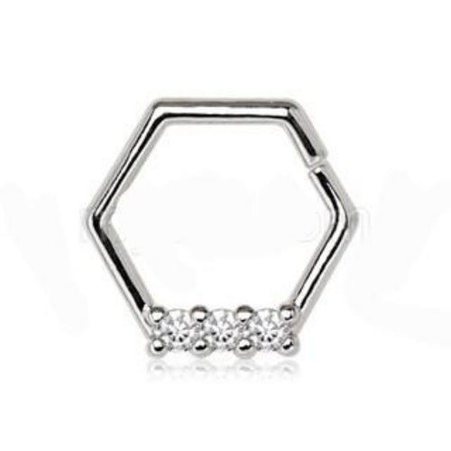 Fulfilled by our friends at Fashion Hut Jewelry• 316L Stainless Steel Hexagon Captive Bead Ring / Cartilage Earring• Unique Hexagon shaped ring with a cut off• Annealed Jewelry (Flexible)• Three tiny Clear CZ• Versatile jewelry can be worn as Captive Bead Ring or Cartilage Earring• Ring Thickness : 16GA |...