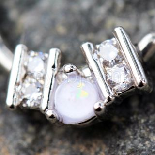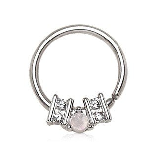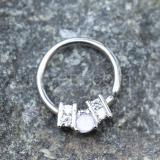 Fulfilled by our friends at Fashion Hut Jewelry• Seamless Ring / Septum Ring with Ornate Design• Combination of Clear CZ and White Synthetic Opal• Two (2) Clear round CZ captured in a double bar on each side• Versatile jewelry that can be worn as Lip Ring, Septum Ring, Cartilage Earring...