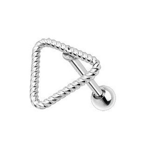 Fulfilled by our friends at Fashion Hut Jewelry• Cartilage Earring with a Triangle Design• Twisted wire triangle attached to a barbell• Bar Thickness : 16GA | 1.2mm• Bar Length : 1/4" | 6mm• Triangle Size : 10(L) x 11(W)mm• Ball Size : 3mm• Thread Type : Externally Threaded• Material :...