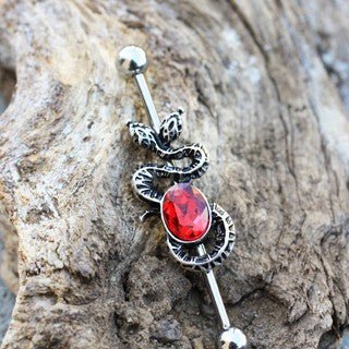 • 316L Stainless Steel Industrial Barbell• Two-headed snake design with an oval shaped Red CZ