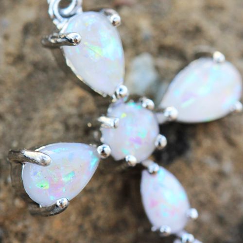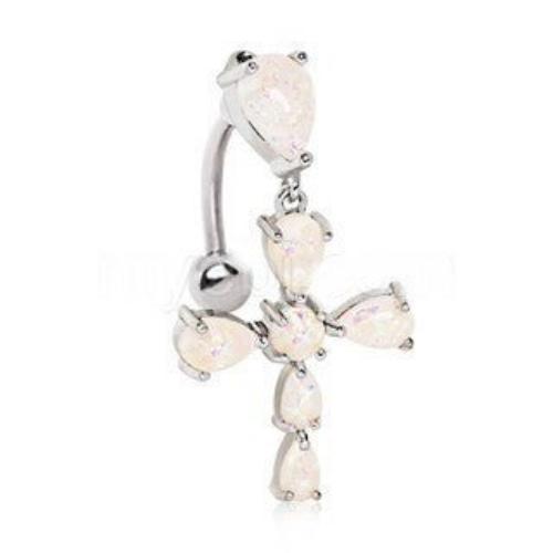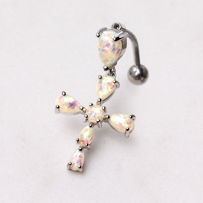 • Belly Button Ring / Navel Ring with a Cross design• White Synthetic Opal displays Rainbow-like Hues that changes with angle of observation