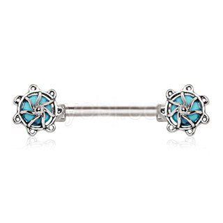 Fulfilled by our friends at Fashion Hut Jewelry• Nipple Bar / Nipple Jewelry with Carousel Design• Unique style of Carousel Tent Top• Synthetic Turquoise stone on each ends• Bar Thickness : 14GA | 1.6mm• Bar Length (Wearable) : 5/8" | 16mm• Carousel Size : 8 x 8mm• Material : 316L...