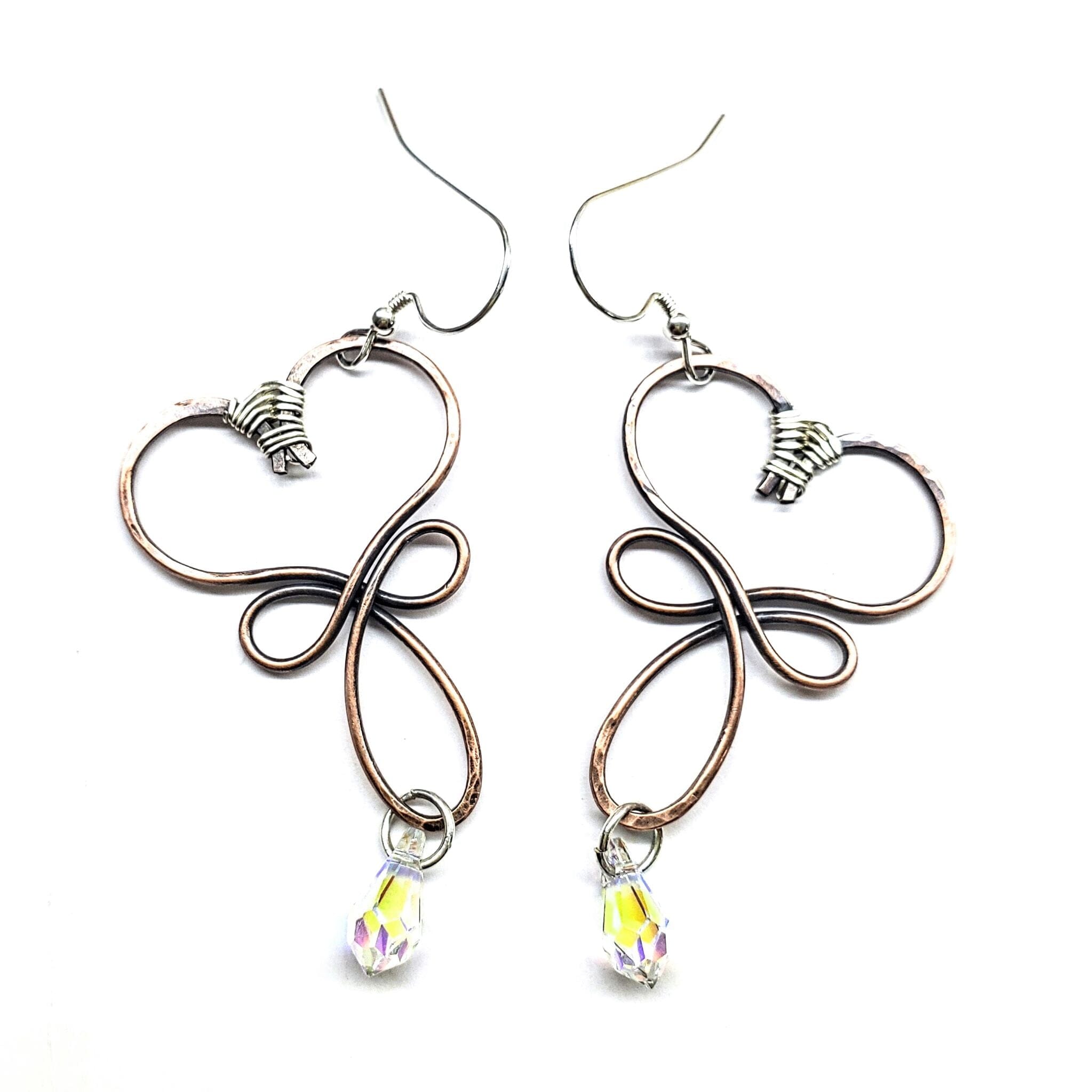 Elegantly fashioned heart-shaped earrings with a blood-red or Crystal AB crystal drop, crafted of hammered and wire-wrapped copper wire. A cross-like shape forms the lower section, with sterling silver ear wires completing the design.