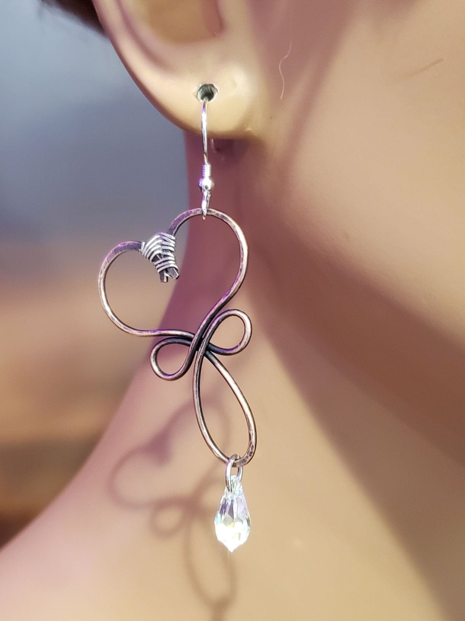 Fulfilled by our friends at Alexa Martha DesignsElegantly fashioned heart-shaped earrings with a blood-red or Crystal AB crystal drop, crafted of hammered and wire-wrapped copper wire. A cross-like shape forms the lower section, with sterling silver ear wires completing the design. Original Designs by Alexa Martha Butler Copper wire Sterling silver...