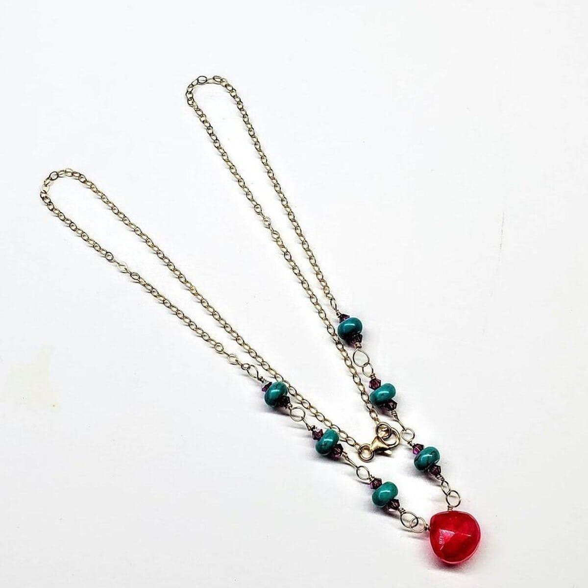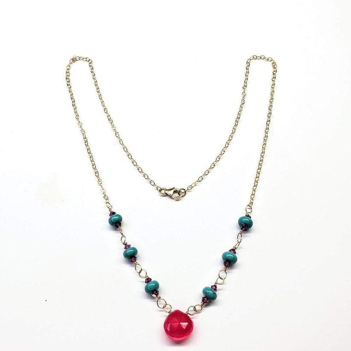 Fulfilled by our friends at Alexa Martha DesignsAdorn yourself with this stunning Gold Filled Pink Chalcedony Turquoise Gemstone Drop Necklace! The gorgeous handcrafted 14K gold-filled chain necklace is complemented with dazzling wire-wrapped turquoise magnesite and fuchsia chalcedony gemstone middle section - it's simply irresistible! Make a unique, eye-catching statement and...