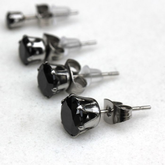 316L Surgical Steel Round CZ Stud Earring. 316L Surgical Steel Stud Earring with finest prong set Cubic Zirconia. Each Earring comes with a metal clutch and a rubber clutch. A grooved post helps to prevent loss of the clutch. Available in 5 CZ sizes.