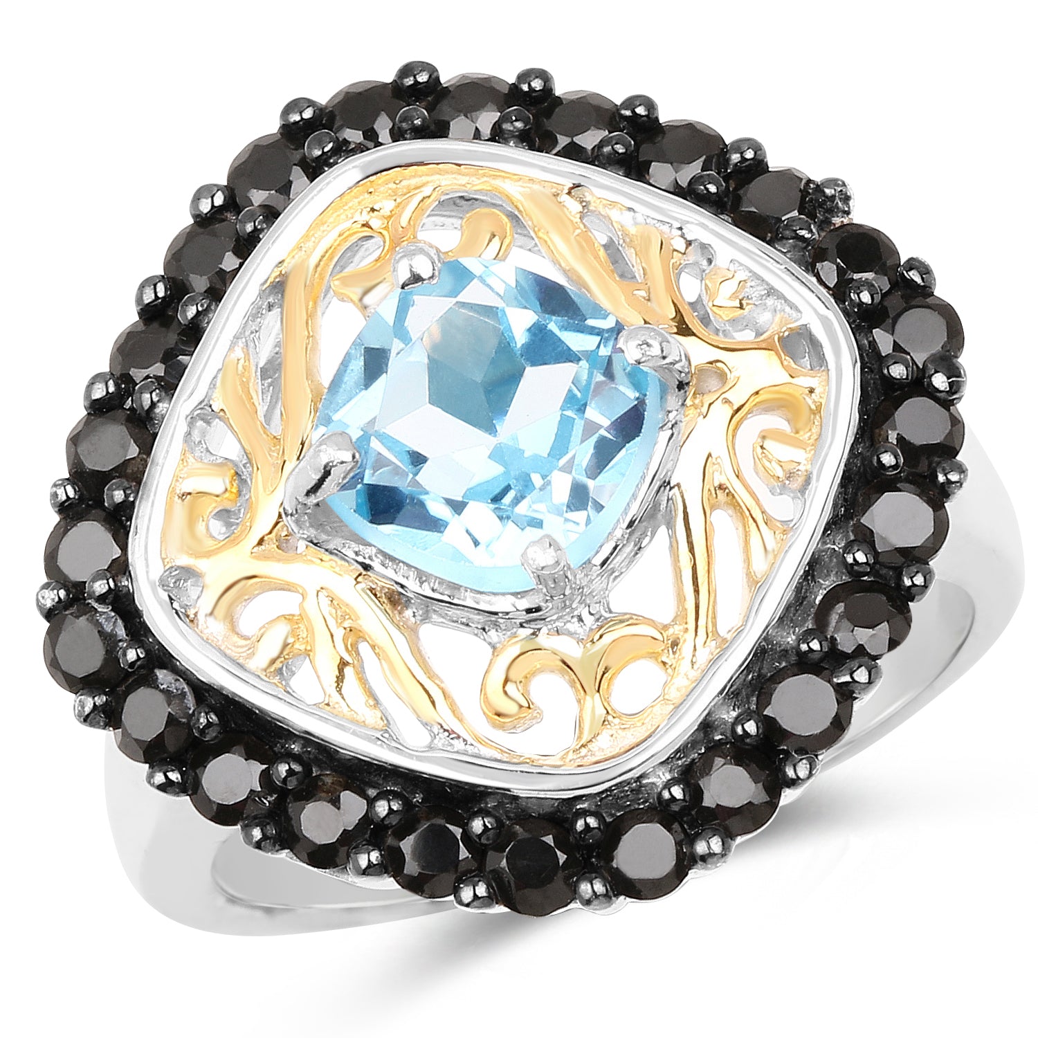 Two Tone Plated 2.85 Carat Genuine Swiss Blue Topaz and Black Spinel .925 Sterling Silver Ring