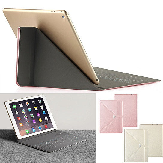The case is made from a spill-proof material with Bluetooth connected keyboard, that will easily make your iPad into a desktop computer! Lightweight and easy to carry, the back of the case folds out to work as a stand. The built-in battery charges the keyboard that lasts for a week of normal use...